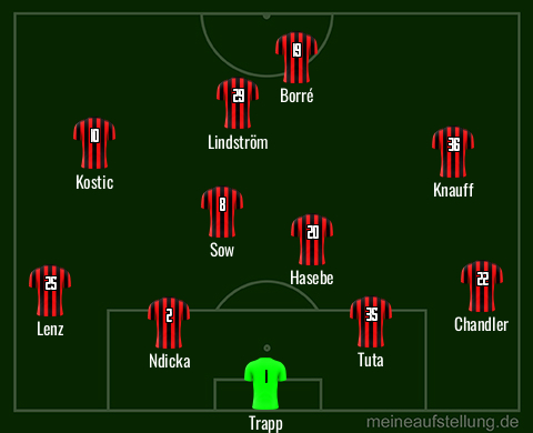 Nachdem mit Hasebe und Ilsanker noch genau zwei defensive Mittelfeldspieler zur Verfügung stehen, gehe ich davon aus, dass Hasebe nach vorne gezogen wird und zusammen mit Sow die Zentrale bilden wird. Und dahinter – wie bereits in dieser Woche geprobt – eine Viererkette mit Lenz, N’Dicka, Tuta und Chandler oder da Costa. Über außen kämen dann Kostic und wahrscheinlich Knauff, Lindström wäre dann hängende Spitze und ganz vorn wieder Borré.