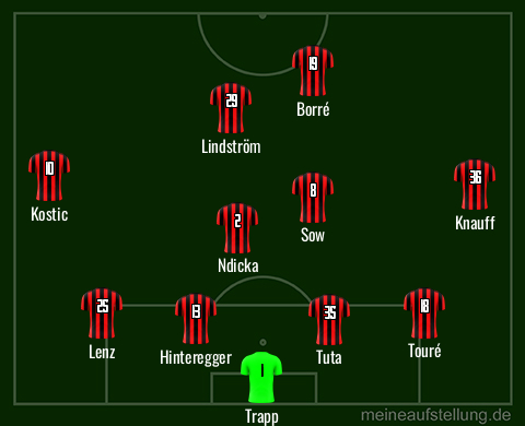 Sicher, da gab es gegen die Bayern durchaus gute Ansätze, Hinteregger scheint wieder in die Spur zu kommen, N’Dicka ist sowieso saustark, auch Tuta war – bis auf seinen Aussetzer beim Gegentor – gut dabei. Trapp steht sowieso außerhalb jeden Zweifels. Wie schon seit Monaten. Einzig die Außen mit Lenz und da Costa waren keine Offenbarung. Wobei ich grundsätzlich dieser Idee mit Lenz hinter Kostic positiv gegenüberstehe. Vielleicht wäre auf der anderen Seite ja ein Pärchen mit Touré und Knauff eine Option gegen die Hertha? Und das ganze noch als Viererkette, um noch einen Platz für einen offensiven Mittelfeldspieler zu gewinnen? Man könnte N’Dicka doch auch eine Position nach vorne ziehen ins defensive Mittelfeld, oder? Als Pärchen zusammen mit Sow? Oder soll Hasebe ins Mittelfeld, falls Rode (wovon derzeit auszugehen ist) länger ausfällt? Oder sollte man Hrustic auf der Sechs aufstellen, oder doch besser Jakic?