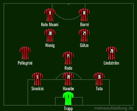 Bei dieser Aufstellung, das muss ich ganz offen sagen, gefällt mir die Lösung rechts hinten nur sehr begrenzt, aber da gibt der Kader halt nicht wirklich was her; und der Versuch mit Knauff in dieser Position war ja auch eher ein Muster ohne Wert. Daher halte ich es eigentlich für wahrscheinlicher, dass der Trainer die Dreierkette beibehält und sich auf Personalwechsel beschränkt. Und ich könnte mir nach der gestrigen Pressekonferenz durchaus vorstelle, dass Marcel Wenig zu einem überraschenden Debüt kommen könnte. Also dann so: