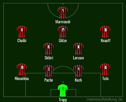 Es wird sicher für Sonntag zurückrotiert werden. Trapp und Pacho wieder auf dem Platz sein. Max wohl für Nkounkou. Ob ich aber vorne etwas ändern würde? Ich glaube fast nicht, ich würde Larsson evtl. auf der Bank behalten und einfach Ebimbe, Knauff, Götze, Skhiri und Chaibi laufen lassen. Und Larsson dann irgendwann reinbringen.