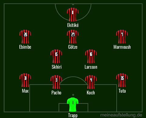 Natürlich, die Mannschaft muss etwas über sich hinauswachsen und die Bayern sollten keinen gelungenen Tag haben, dann könnte es klappen. Ohne den weiterhin maladen Rode und wahrscheinlich ohne den erkrankten Chaibi kann der Trainer aus dem Vollen schöpfen und fast die gleiche Truppe wie gegen Augsburg aufbieten. Man könnte sich vorstellen, dass Chaibi durch Larsson ersetz wird und Götze etwas weiter nach vorne rutscht, was dann wohl am Ende des Tages eine etwas defensivere Grundordnung geben würde. Also etwa so: