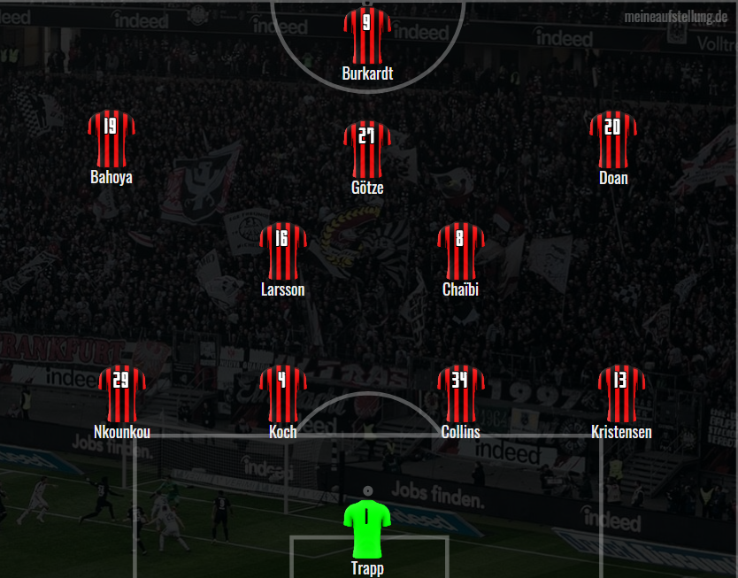 Nachdem, was aus der Vorbereitung bekannt ist, tippe ich folgende Aufstellung. Arthur Theate ist im Pokal noch gesperrt, Kevin Trapp wird, laut Toppmöller in der PK, auflaufen:
