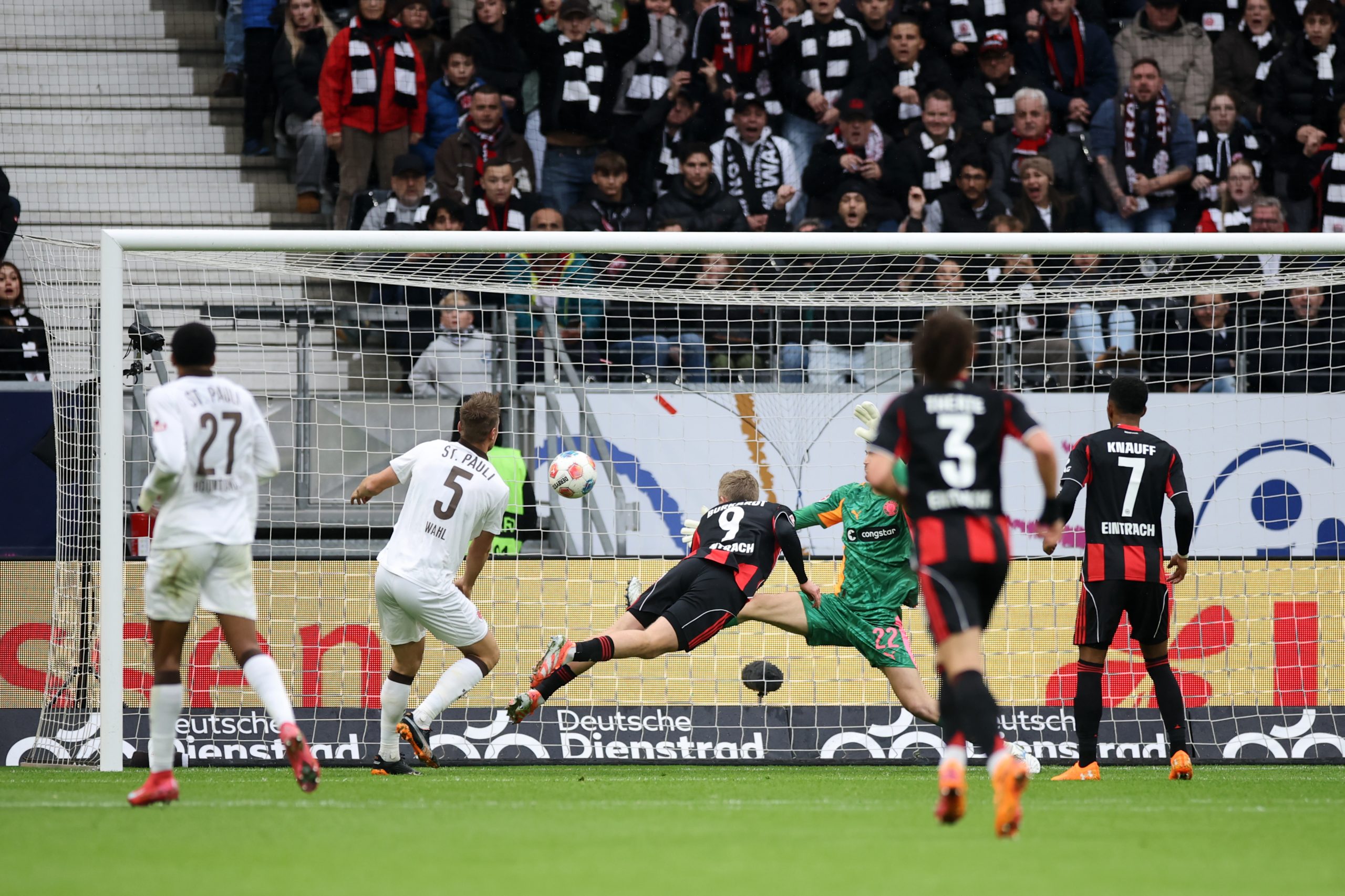 In den kommenden 74 Minuten spielte dann nahezu ausschließlich die glorreiche SGE, tat sich aber wie so oft schwer, die massiv defensiv aufgestellten Gäste auszuspielen. Es gab durchaus die eine oder andere Chance, es war aber in der ersten halben Stunde nicht viel zwingendes dabei. Es brauchte schon die gütige Mithilfe von Vasilj, der im Tor von St. Pauli eine Flanke von Uzun durch die Finger gleiten ließ, die dann Burkardt mit dem Kopf zum 1:0 in Minute 36 veredelte.
